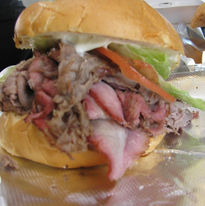 (1/4 lb. beef hot dog topped with surloin steak, fried onions, lettuce, tomato & mayo)